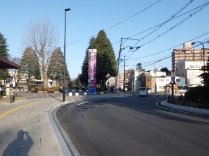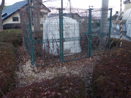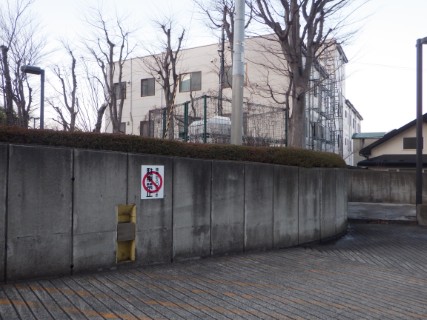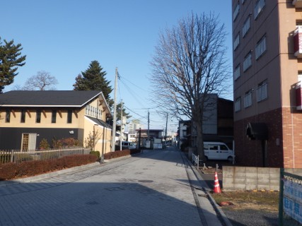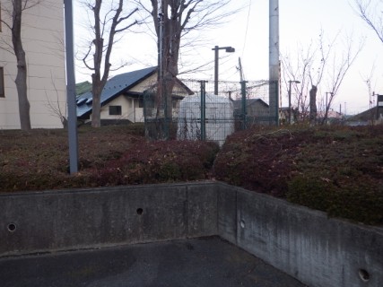 観測点近傍には段差がある.北側は右奥の住宅と比較して1階の階高程度の高さ.